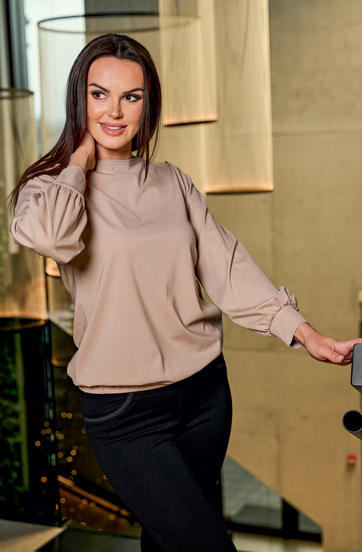 Elegantní dámská halenka s lodičkovým výstřihem a širokými dlouhými rukávy s manžetou. Halenka má délku ukončenou do gumičky. Je vyrobená z viskózového materiálu.