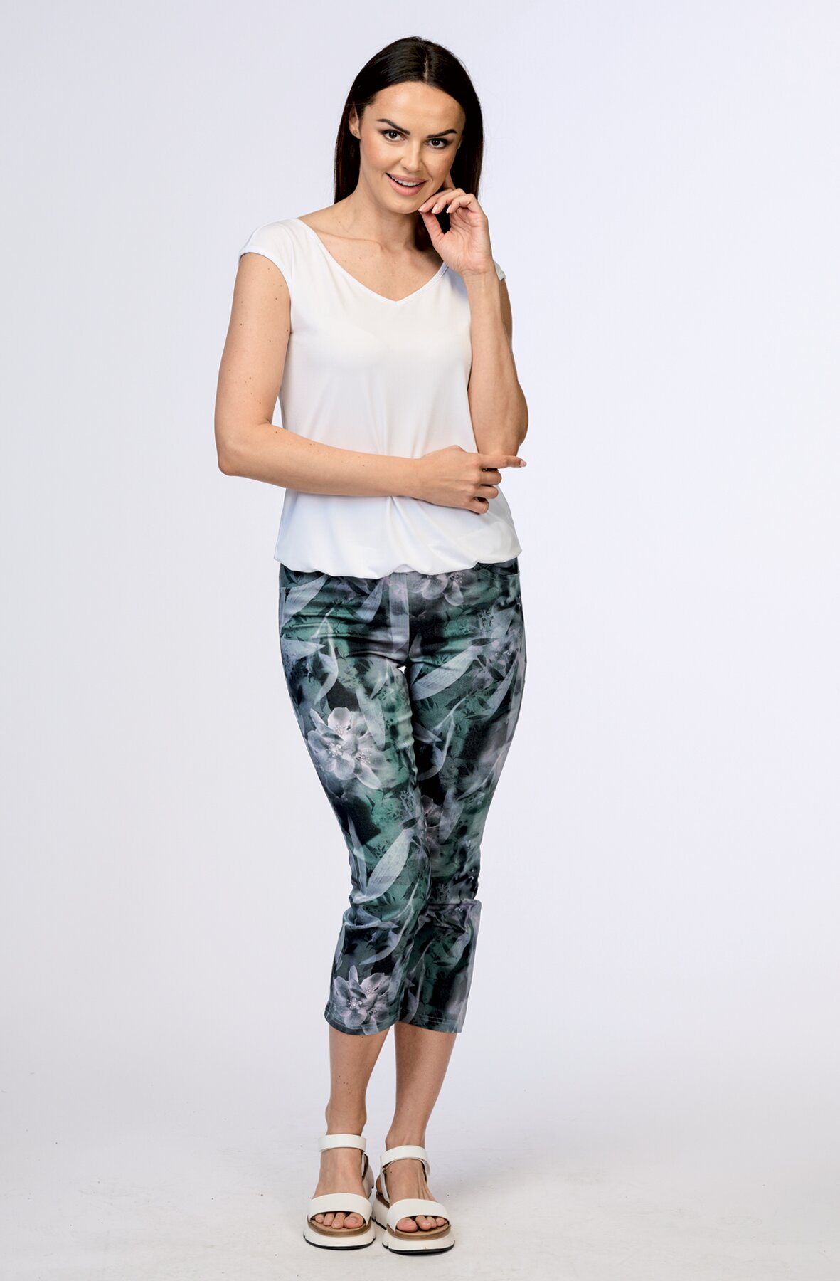 Dámské elegantní 3/4 kalhoty s úzkými nohavicemi. Na předním díle mají falešné kapsy a na zadním díle je sedlo.