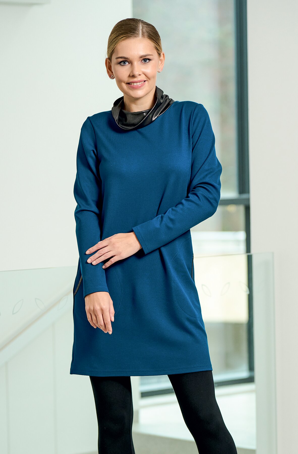 Kratší dámské šaty volnějšího střihu s dlouhými rukávy a kapsami. Šaty mají kontrastní rolák a kontrastně olemované kapsy.